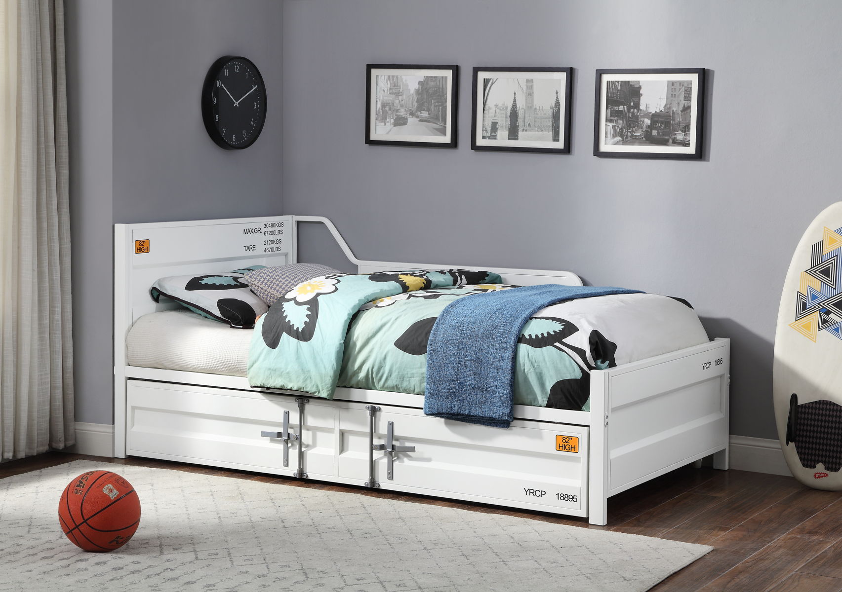 - Design and Style: This daybed features a unique cargo container style with a metal frame and recessed panels. It includes a full-length container lock, adding to its industrial aesthetic. The main color is white, complementing various decor styles.