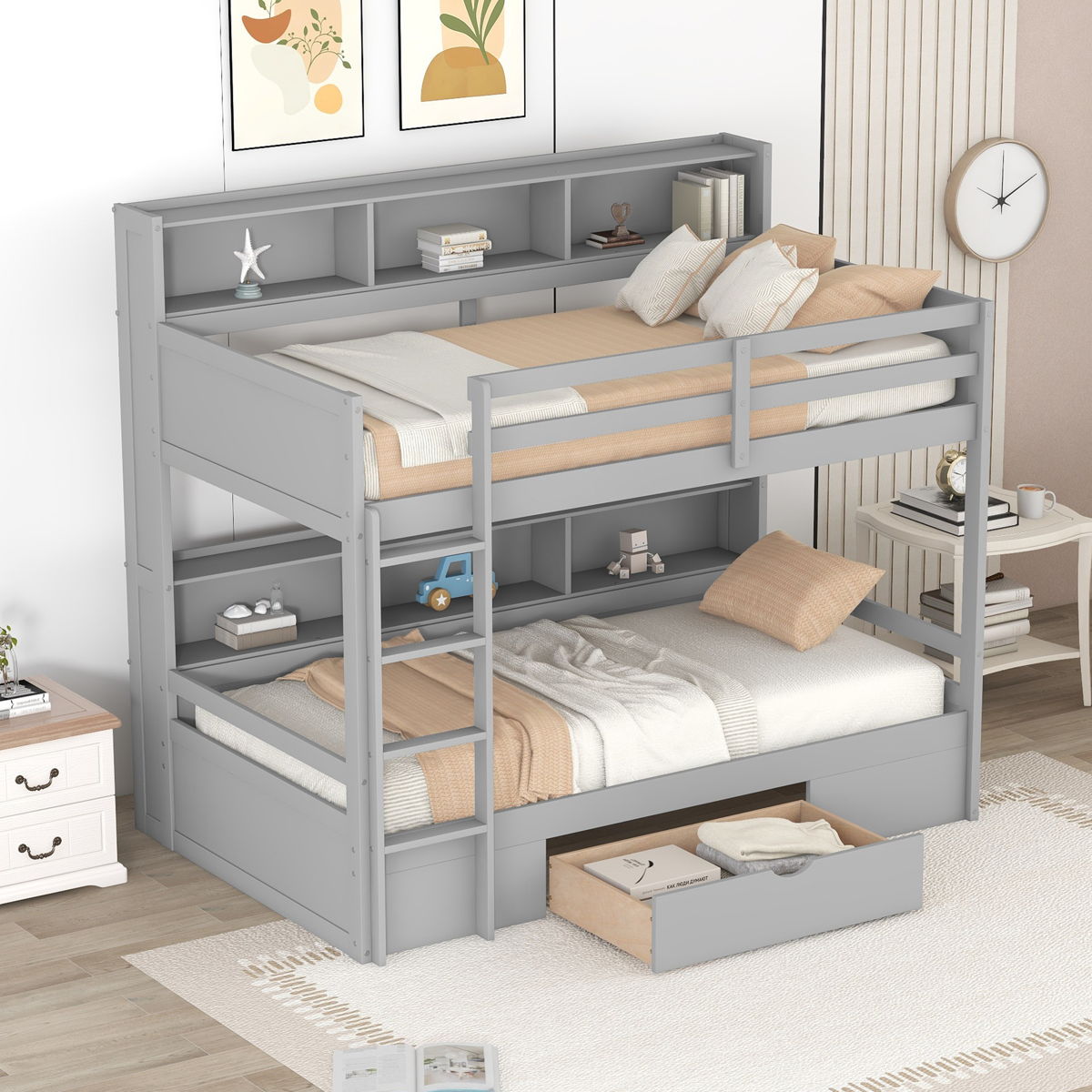 Size Bunk Bed with Built-in Shelves Beside both Upper and Down Bed and Storage Drawer,